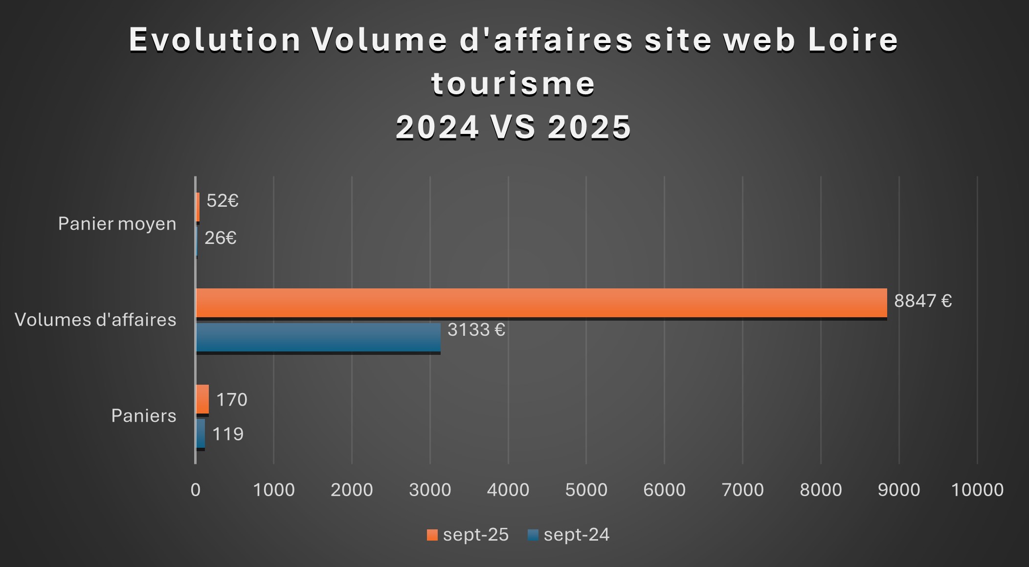 Entre janvier et septembre 2025, le site Loire Tourisme a généré 170 réservations soit un volume d’affaires de 8 447 €. Sur la même période en 2024, le volume d’affaires était de 3 133 € pour 119 réservations.