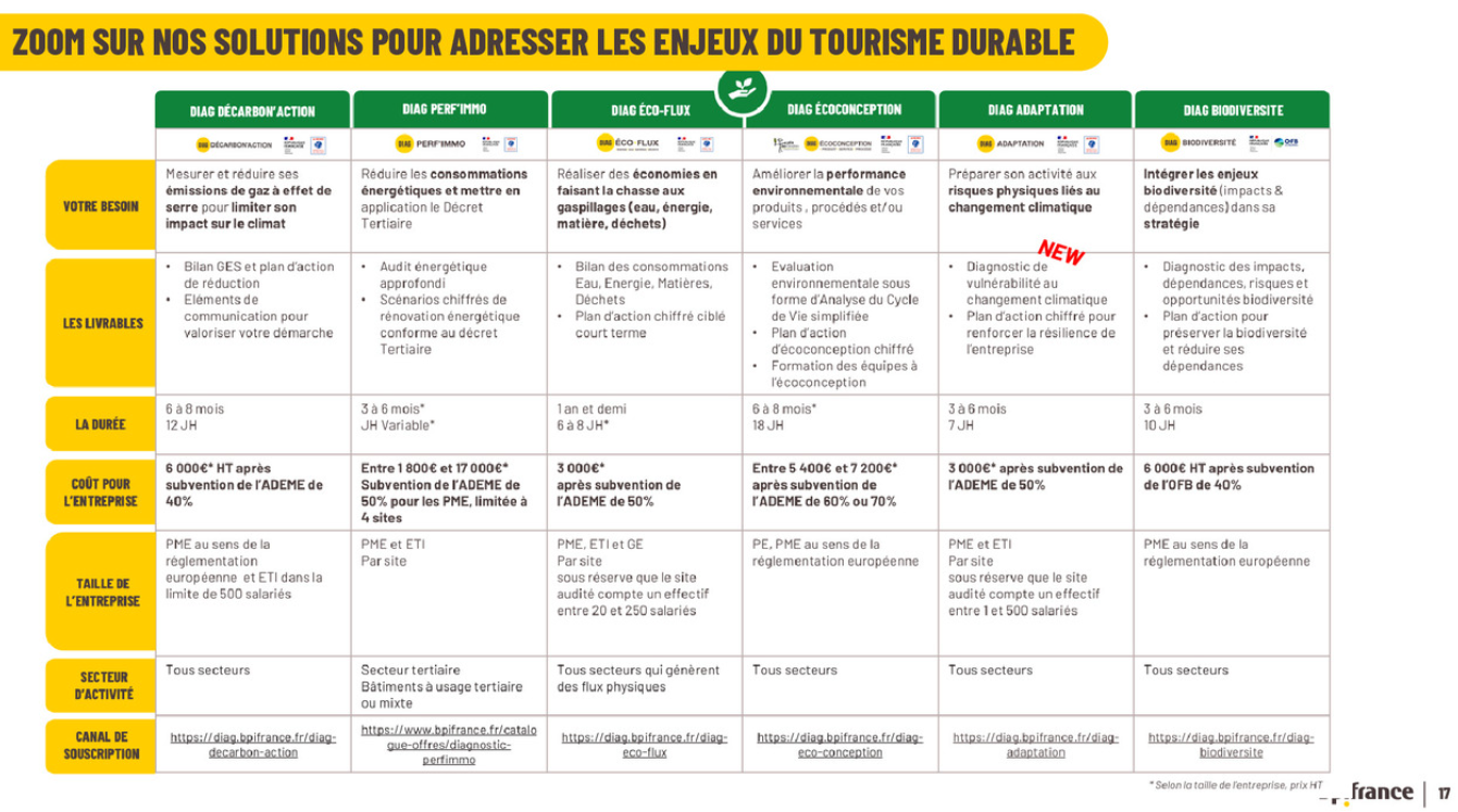 Bpifrance propose, en partenariat avec l’ADEME, des diagnostics externes réalisés par des consultants spécialisés. Ces diagnostics permettent à votre structure de mesurer ses impacts, d’identifier des gisements d’économies et de construire un plan d’action concret et chiffré. Ils sont fortement subventionnés.