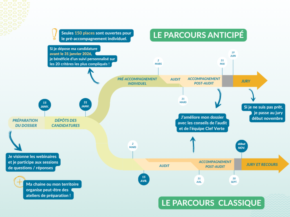 Tic-tac… Si vous avez suivi notre parcours d’accompagnement ou que vous souhaitez vous lancer, c’est le moment de passer à l’action : la date limite de candidature au label Clef Verte est fixée au 15 avril 2026 !